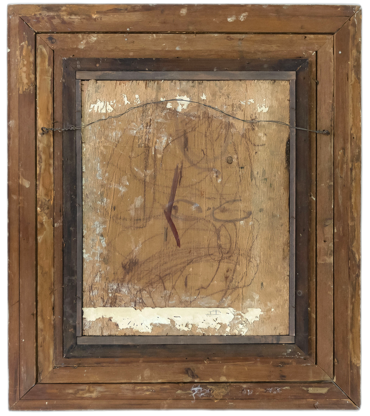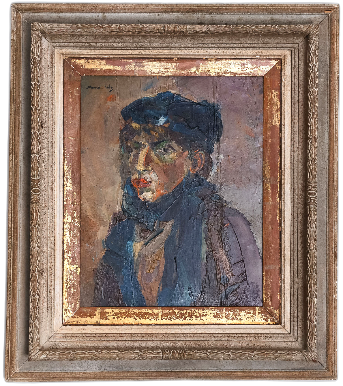 In 2024, this painting was discovered in northern Brazil, in Fortaleza. It depicts a man wearing a cap and a blue scarf. The frame is not original; it was replaced because the previous one was very old, damaged, and infested with woodworms. While the oil painting and canvas strongly recall the themes and style of Mané-Katz, we are seeking to confirm 100% its authenticity, identify the person portrayed, and ultimately uncover the painting’s history. It may be an early, previously unknown work by Mané-Katz and therefore has not yet been catalogued in the artist’s catalogue raisonné. Dimensions: 41 × 51 cm.